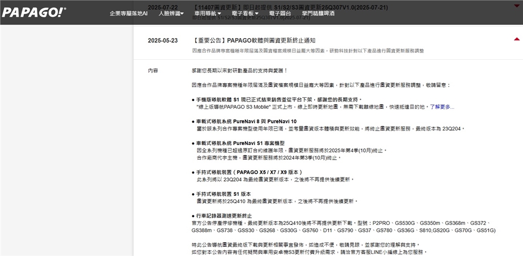 以上資訊為截取PAPAGO網站公告,截圖如下: